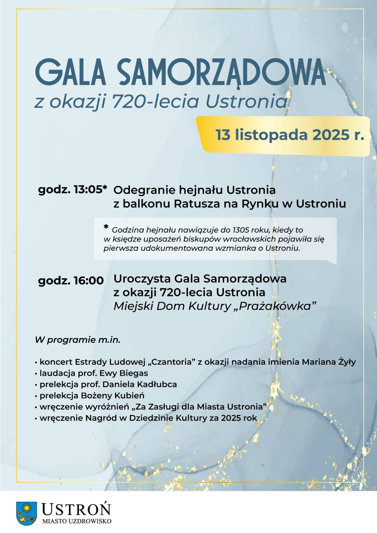 O godz. 16:00 w MDK Prażakówka odbędzie się Uroczysta Gala Samorządowa z okazji 720-lecia Ustronia.