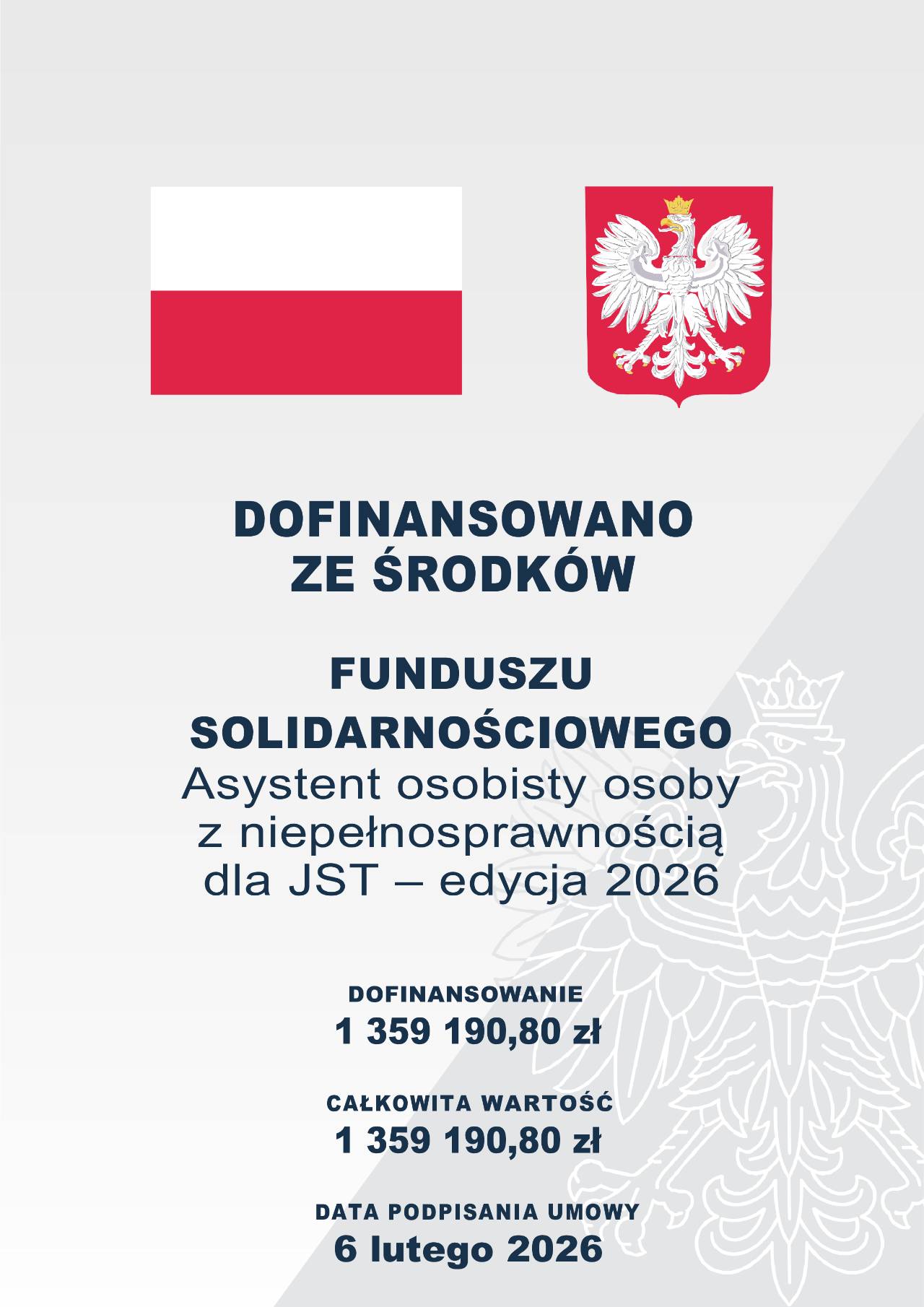 Wysokość środków otrzymanych przez Gminę Ustroń z Funduszu Solidarnościowego na realizację Programu „Asystent osobisty osoby z niepełnosprawnością” dla Jednostek Samorządu Terytorialnego – edycja 2026 wynosi 1 359 190,80 zł.