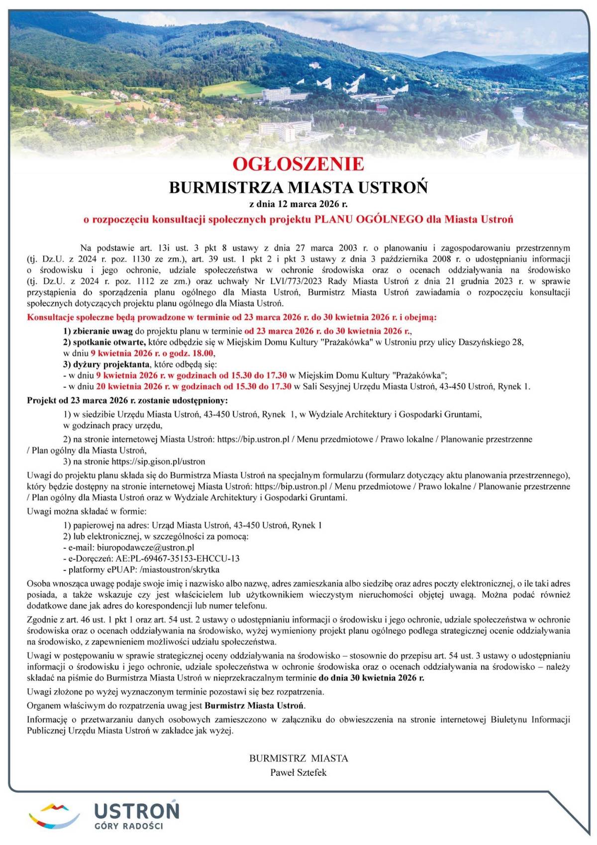 z dnia 12 marca 2026 r.o rozpoczęciu konsultacji społecznych projektu planu ogólnego dla Miasto Ustroń