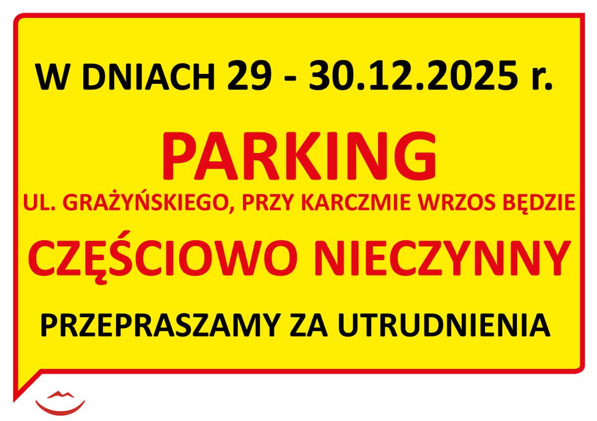W dniach 29-30.12.2025 r. parking ul. Grażyńskiego, przy Karczmie Wrzos będzie częściowo NIECZYNNY.