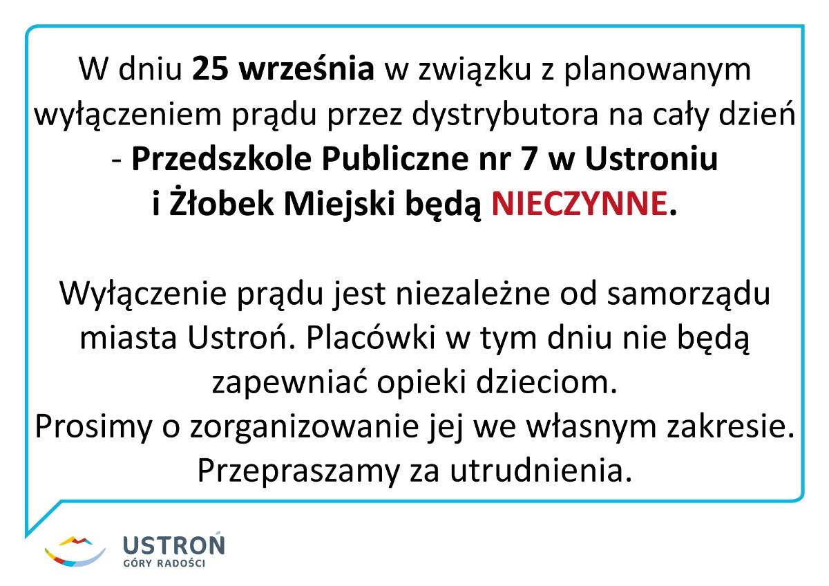 Planowane wyłączenie prądu w dniu 25.09.2025 r. - informacja dla rodziców dzieci uczęszczających do Żłobka miejskiego i Przedszkola nr 7