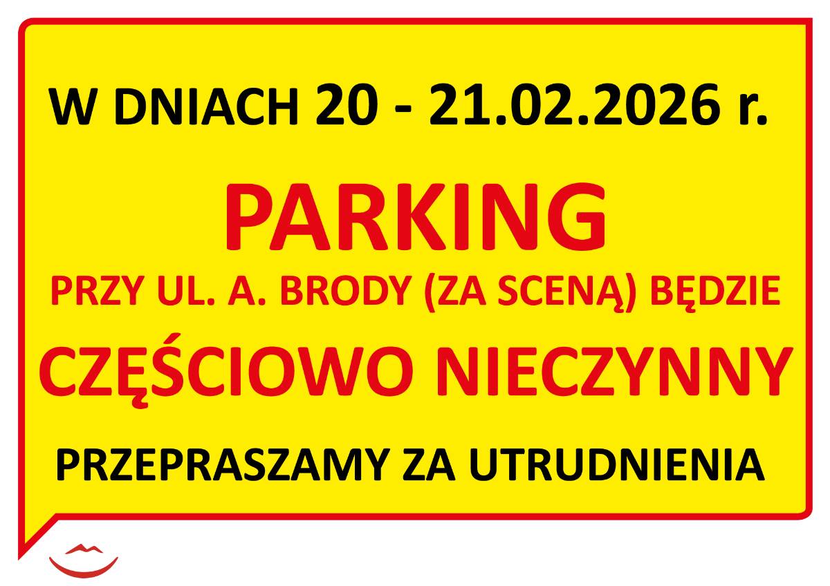 W dniach 20-21.02.2026 r. parking przy ul. A. Brody (za sceną) będzie częściowo nieczynny.