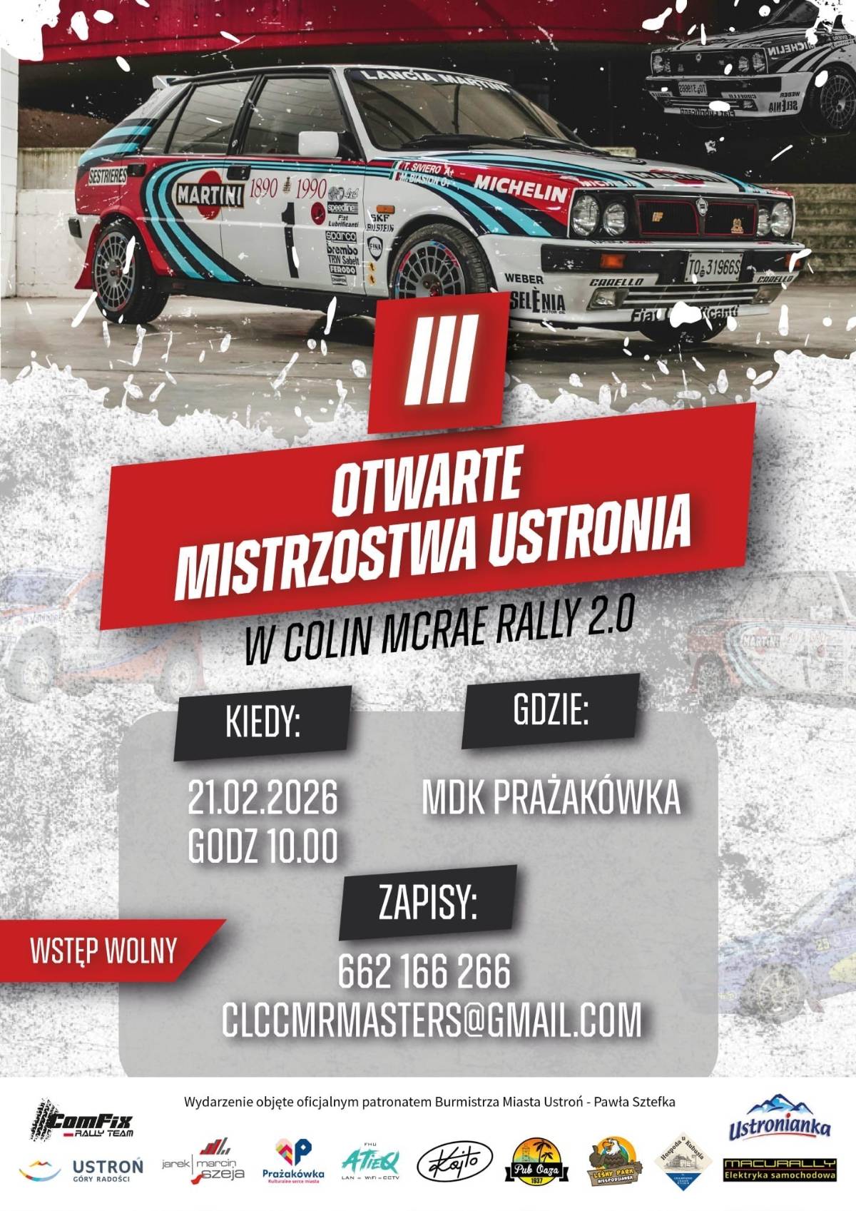 21 Lutego 2026 zapraszamy na 3 edycję Otwartych Mistrzostw Ustronia w Colin McRae Rally 2.0. W tym roku Honorowy Patronat nad imprezą objął Burmistrz Miasta Ustroń - Paweł Sztefek. Podobnie jak w poprzednim roku, czekają na nas malownicze trasy znane z drugiej odsłony kultowej serii gier Colin Mcrae Rally. Zawody zorganizowane zostaną wraz z MDK Prażakówka w Ustroniu, na sali widowiskowej - przy ul. Daszyńskiego.