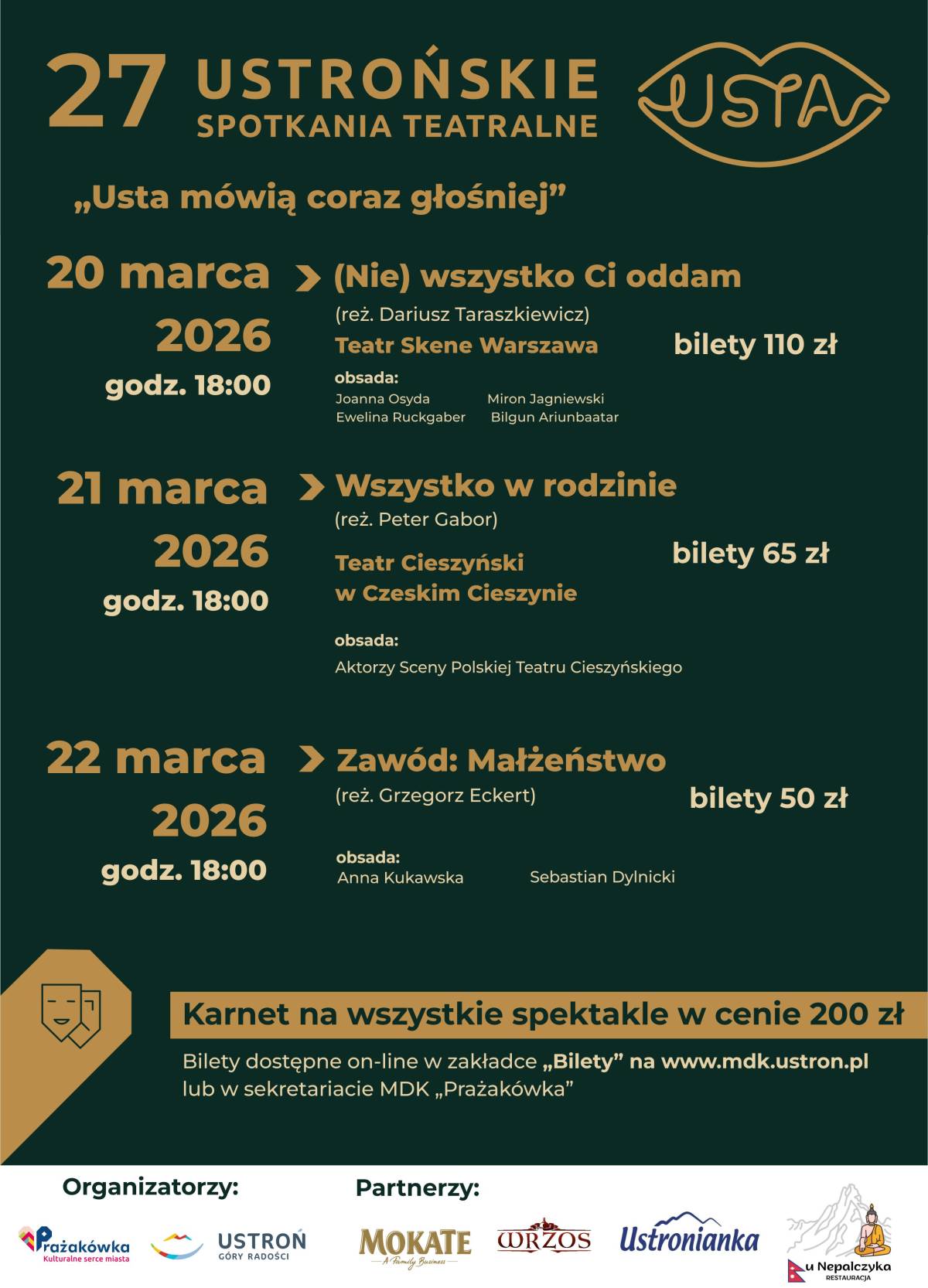 Bilety z 10% rabatem na Ustrońską Kartę Mieszkańca dostępne tylko w kasie MDK "Prażakówka" w celu weryfikacji karty.
