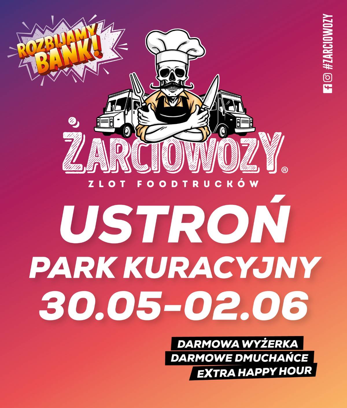 Przygotowaliśmy dla Was coś, czego jeszcze nikt nie zrobił. Na Żarciowozach specjalnie dla WAS każdego dnia zlotu – przez pierwszą godzinę będziemy: wydawali za darmo porcje degustacyjne z każdego Foodtrucka; wydawali za darmo wejściówki na jednego dmuchańca dla dzieciaków. Podczas drugiej godziny każdego dnia zlotu, oprócz standardowego menu, będziemy mieli ofertę specjalną „Happy Hour”, każdy Żarciowóz, wyciągnie „spod lady” menu tylko na godzinę, z którego będzie serwował jedno specjalne danie. To będą nietuzinkowe potrawy, kulinarne wariacje i ciekawe połączenia smaków. Oferty oczywiście będą ograniczone.